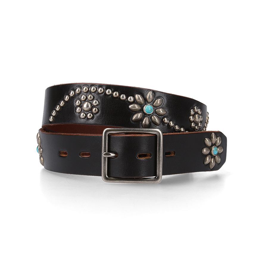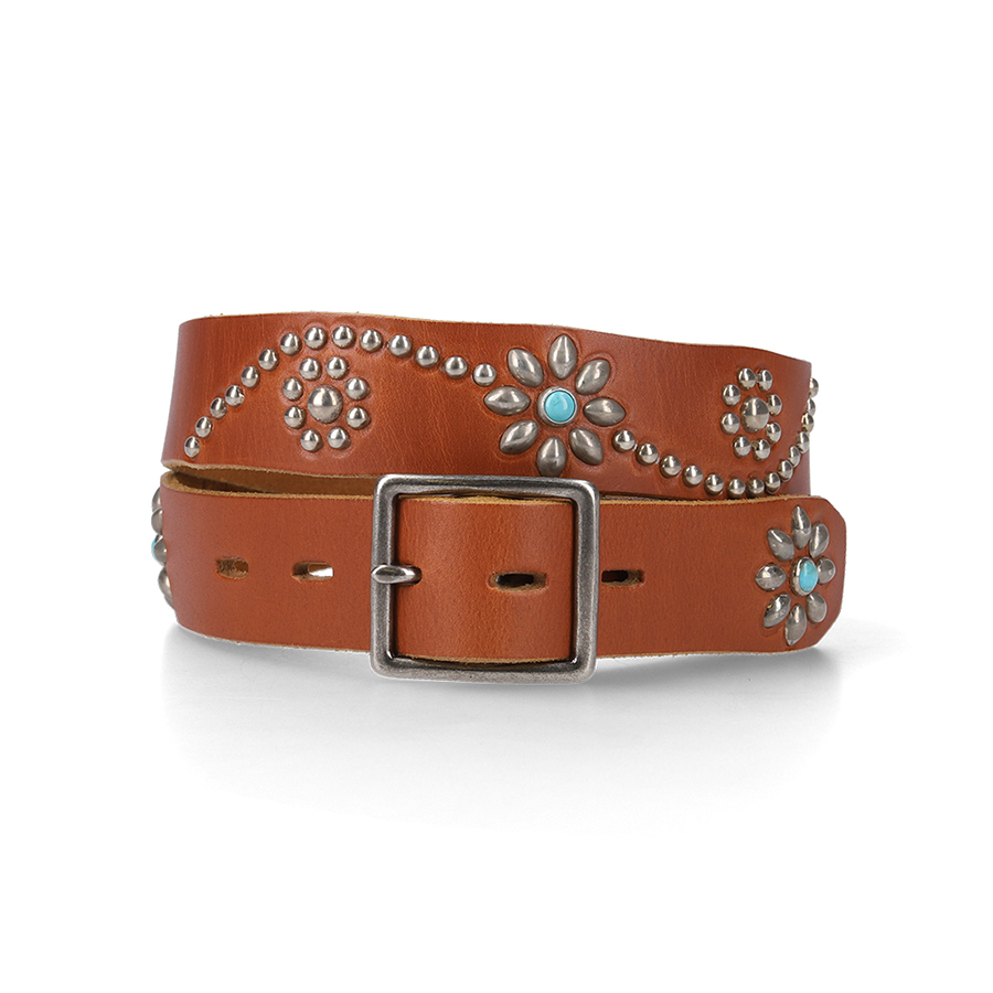 1.25inch幅のHTCベルトです。 スタッズワークはサイドとバック、そしてエンド部分に施してあります。 定番のフラワーモチーフにターコイズ。 安定の組み合わせです。 ※革製品の性質上、衣服に色移りする場合があります。 ※サイズについては下記SIZE GUIDEとこちらのブログをご覧ください。 ※レザーのカラーは個体差がございます。予めご了承ください。 [ SIZE GUIDE ] Color