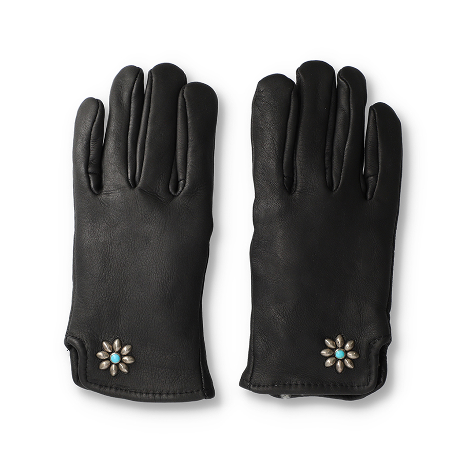 フラワーモチーフとターコイズがレザーグローブによく合います。