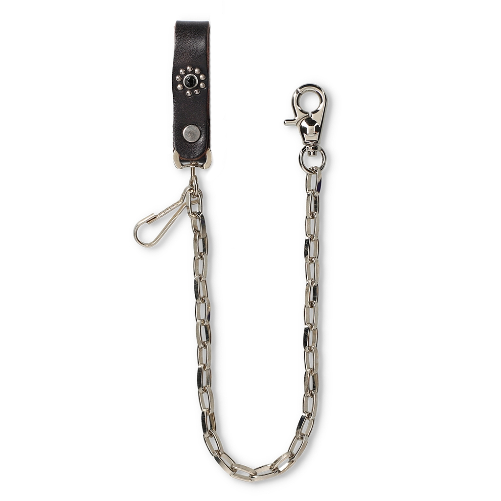 HTCのウォレットチェーンです。 シンプルなフラワーモチーフのスタッズワークです。 スタッズ、チェーン、ナスカン等金属部分はヴィンテージのような風合いに加工が施されています。 ブラックにはブラックのラインストーン、ライトブラウンにはクリアーのラインストーン、ダークブラウンにはアンバーのラインストーンです。 ※革製品の性質上、衣服に色移りする場合があります。 ※レザーの色は天然素材の為、色ブレがございます。予めご了承ください。